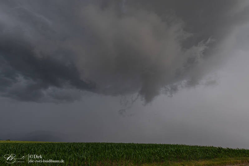 die mittlerweile zum starken Einzelgewitter gewandelte Zelle senkt direkt vor mir ihre benannte Basis sehr dynamisch immer weiter in Richtung Boden ab und eine erkennbar Trichter förmige Struktur rotiert dabei.