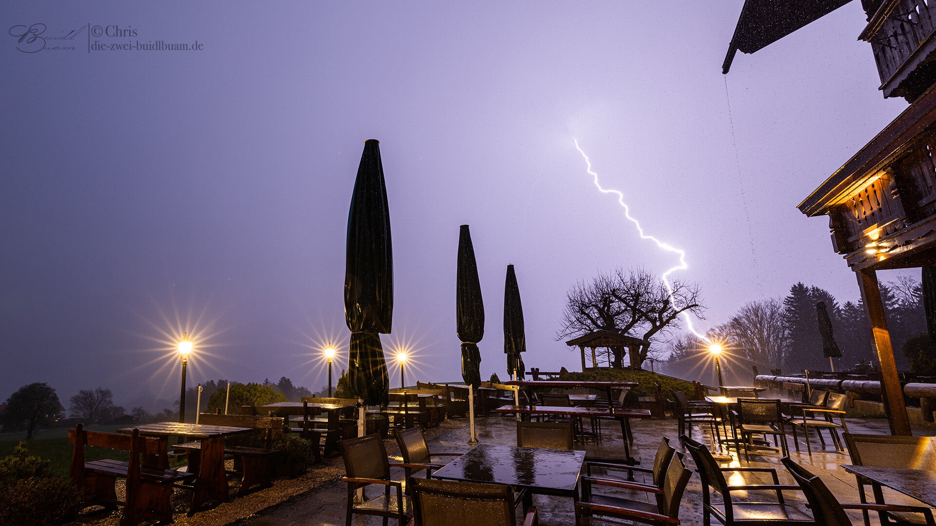 Ein doppelter Blitzeinschlag bei Bad Endorf, wobei der eine bei Unterkurf in die Weide scheppert und der andere beim DM-Markt ins Gewerbegebiet kracht. Der See im Vordergrund ist der Simssee.