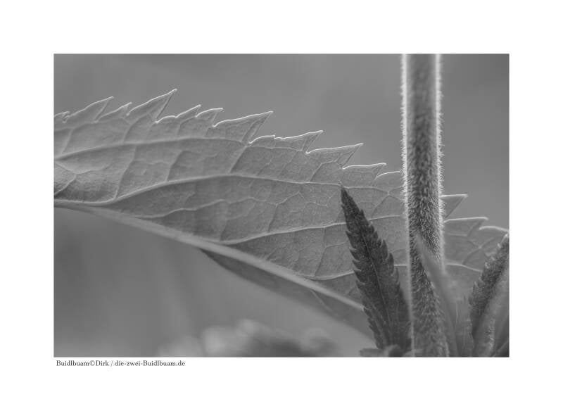 Hier habe ich am Boden liegend einfach in die vor mir stehende Pflanzenwelt fotografiert. Mir war besonders das schmale, harte Licht auf der Blattkante aufgefallen. Somit stellte ich meine Kamera so ein, dass die Schärfe, wenn möglich, nur auf dieser Blattkante oder zumindest auf einem Ausschnitt davon sitzt. Mir war vorher schon klar, dies wird ein Schwarzweißbuidl, wo es schlussendlich um Strukturen und Licht geht.