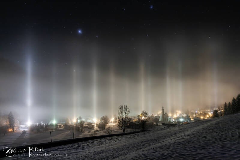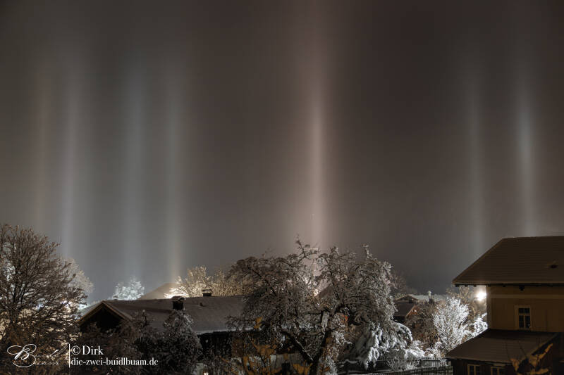 Es handelt sich hierbei um Lichtsäulen. Lichtsäulen zählen zu den etwas selteneren Wetterphänomenen, genauer zu meteorologisch-optischen Erscheinungen kalter Regionen. Man bekommt sie aber unter perfekt zusammenspielenden Grundlagen / Bedingungen durchaus auch in unseren Regionen zu Gesicht. In dieser sensationellen Ausprägung, wie ich sie im oberen Bild zeige, hier bei uns wohl eher sehr selten. Das war schon großes Kino und dauerte in dieser perfekten Art und Ausprägung bei abnehmendem verdeckenden Nebel nur wenige Minuten.