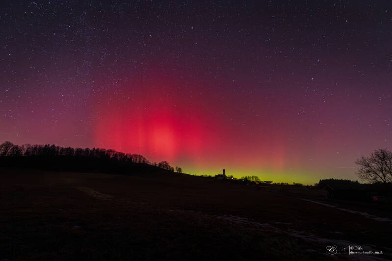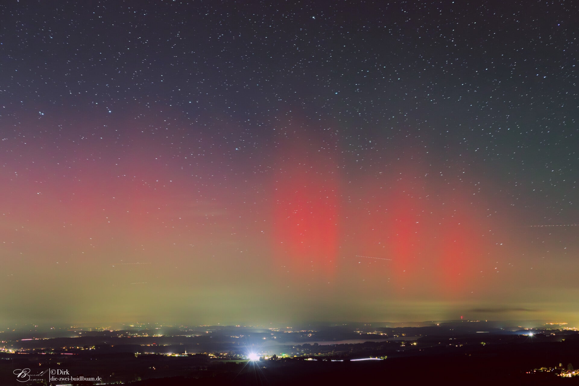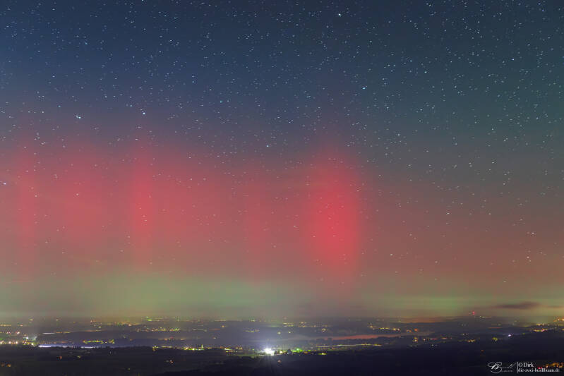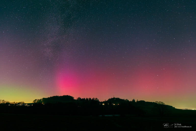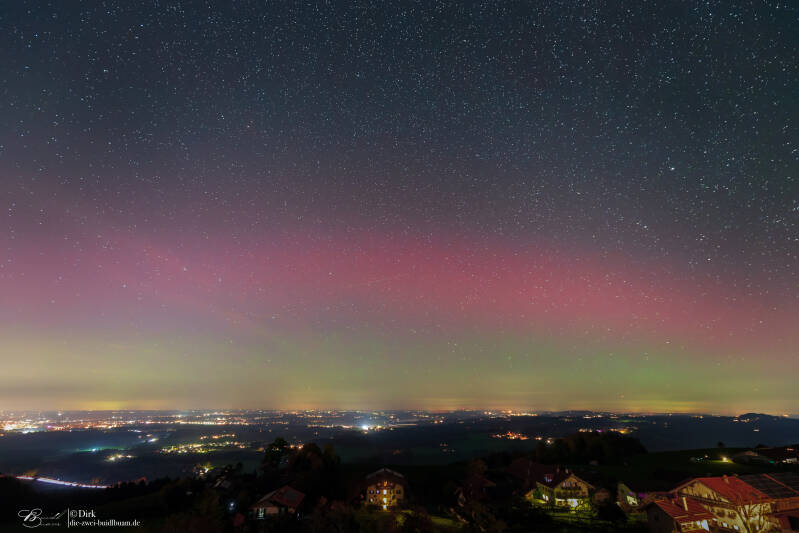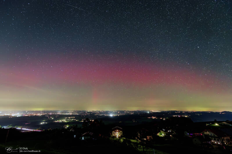Ab rund 21Uhr gab es über die gesamte Nacht Polarlichter in drei Schüben - fotografisch wie auch deutlich visuell . Gegen 21.30Uhr für gut 20min sehr deutlich mit einem G3 Sturm. Unter besagt roten Bogen war sogar ein grünlich-gelber deutlich sichtbar. Das ist für eine Polarlichtbeobachtung über'm Ländle schon sehr selten.