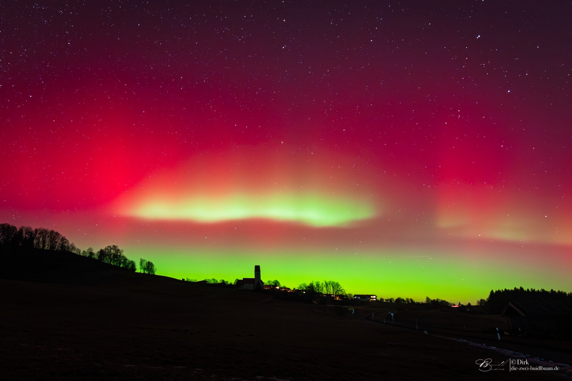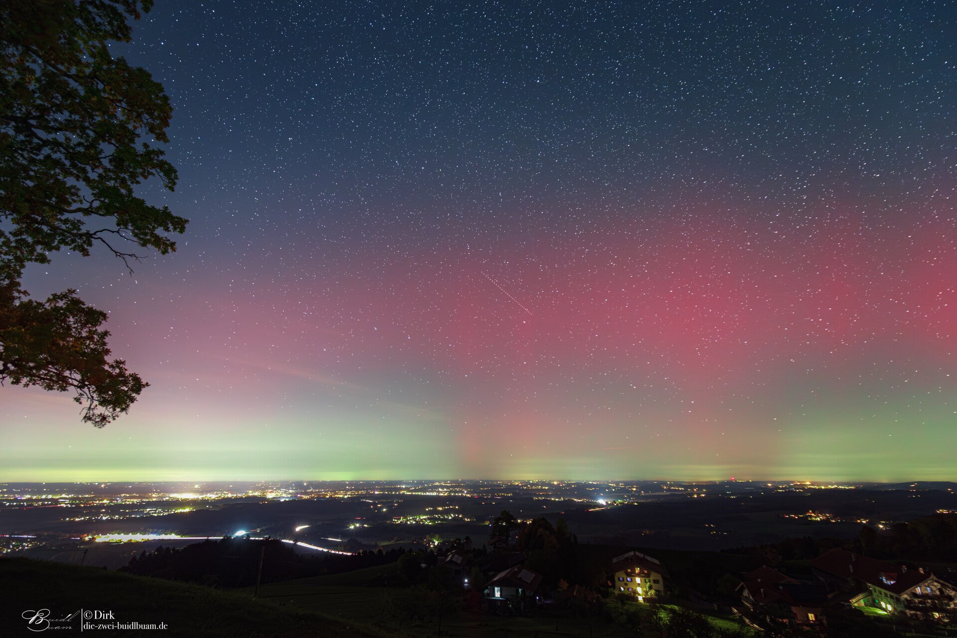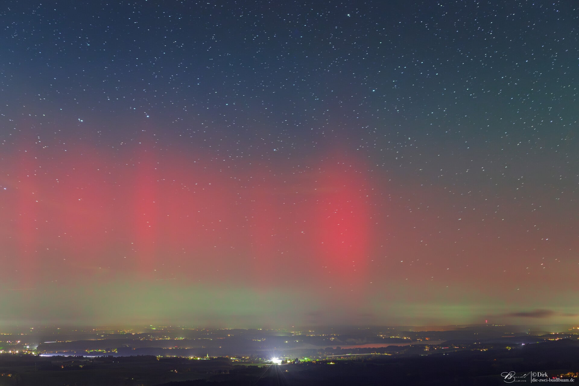 Ab rund 21Uhr gab es über die gesamte Nacht Polarlichter in drei Schüben - fotografisch wie auch deutlich visuell . Gegen 21.30Uhr für gut 20min sehr deutlich mit einem G3 Sturm. Unter besagt roten Bogen war sogar ein grünlich-gelber deutlich sichtbar. Das ist für eine Polarlichtbeobachtung über'm Ländle schon sehr selten.