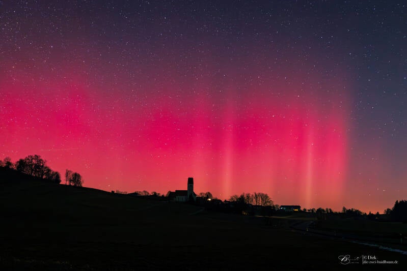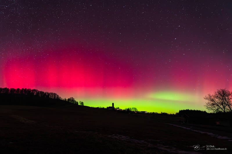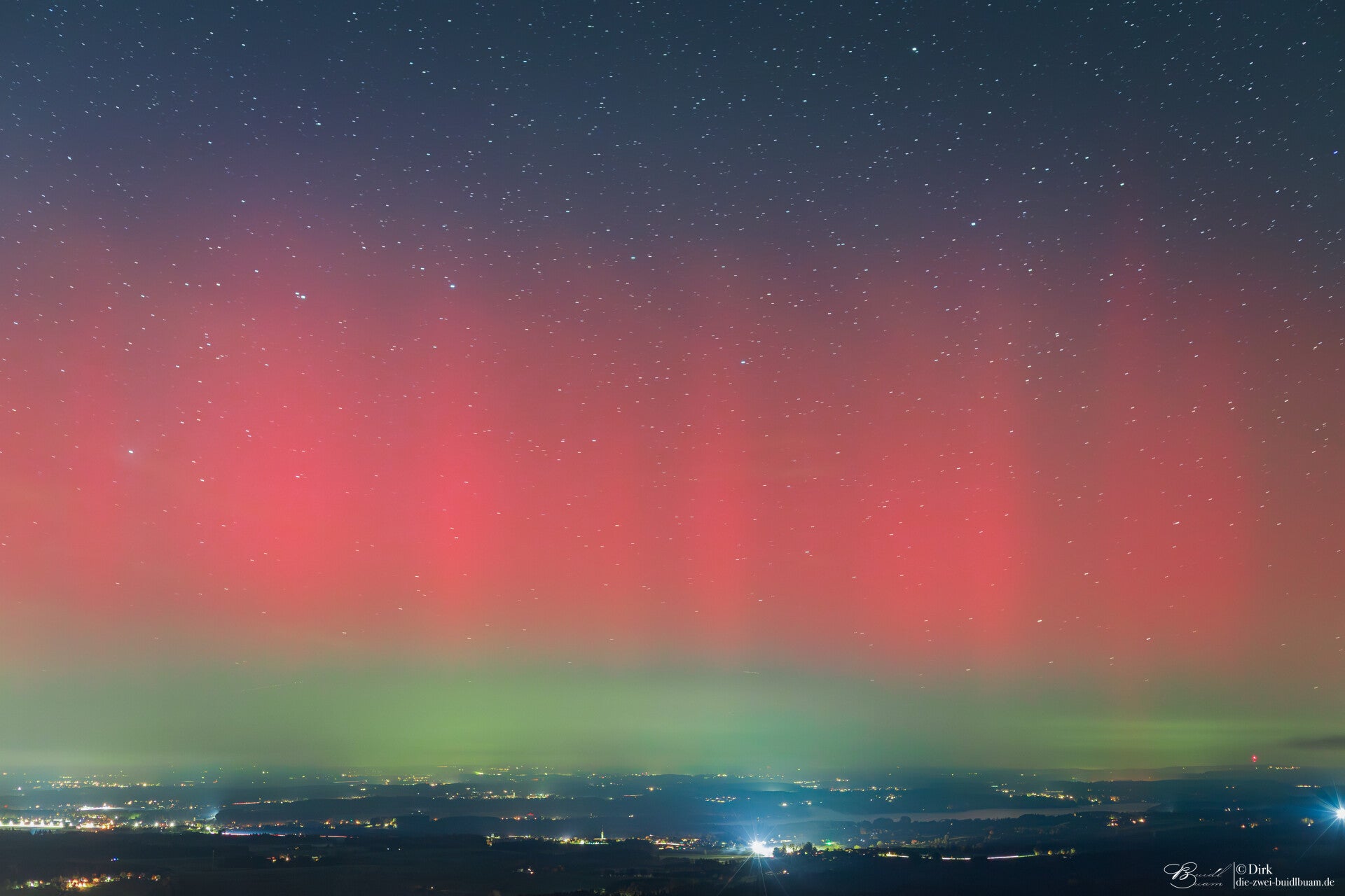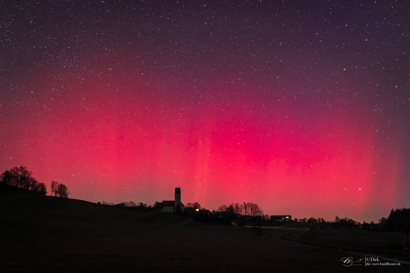 So, der Sonnenzyklus läuft ja noch und brachte einen dritten sehr heftigen Sonnensturm. Und was man wieder sehen und erleben durfte - Freiluftkino das es besser nicht geht! Dieser Sturm erreichte abermals G5 und im KP-Index 9 bis 10. Dieser hält nach seiner stärksten Phase auch noch an und wird somit 2Tage am Stück aktiv sein. Aktuell gibt' s immer wieder unterschiedlich starke Peaks, welche zumeist (hier auf's alpine Ländle bezogen) fotografisch, kurzzeitig aber auch visuell zu bestaunen sind. Mit seiner komprimierten Hautphase war es einer der stärksten Sonnenstürme der letzten Jahrzehnte. Ein Wort dazu, ob ein solcher Sturm auf der Erde Schäden anrichten kann, denn ich werde ab und an danach gefragt. Sagen wir mal so, bis das es bei uns zu schwerwiegenden, wirklichen Störungen bei Energie und Versorgen oder auch in der Telekommunikation kommt, so muss solch ein Sturm schon noch ein ganz anderes Kaliber auffahren. Ich würde schätzen, dass er sich dafür mindestens mal verdreifachen, wenn nicht sogar vervierfachen müsste. Aber es ist schon ein gewaltiges Szenario, was sich zumindest in absolut fantastischen Bildern zeigt. Hier ein paar erste Buidl aus der Region Frasdorf im Chiemgauer Ländle. Der Chris wird aus NRW noch absolut irre, fantastische und phänomenale Bilder, besonders aber auch Zeitraffer zeigen. Wie immer zählt - das sind sehr große Datenmengen, die Zeit dafür ist nicht immer direkt verfügbar, somit braucht es bissle Zeit! Ihr könnt Euch aber sicher sein, der Computer qualmt schon, weil er rechnet und läuft ohne große Pausen.