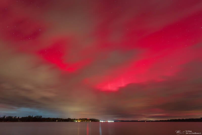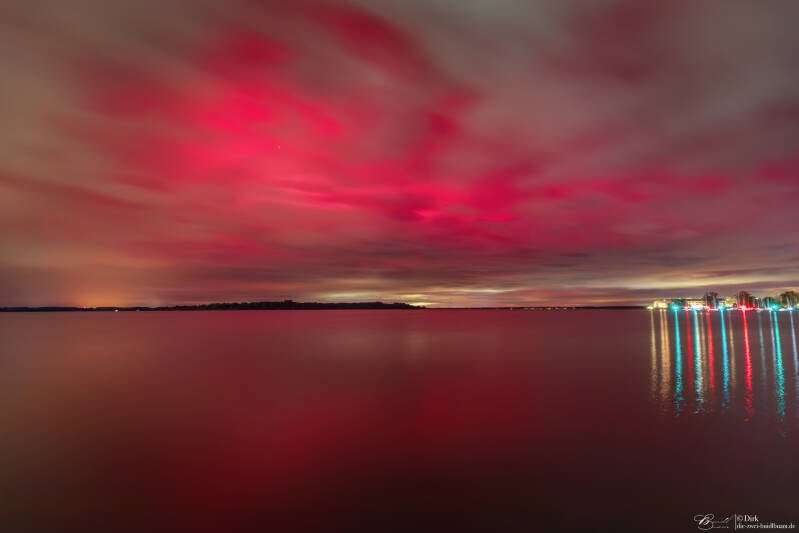 Dabei wurde ein G5 Sonnensturm erfüllt, der BZ Wert ging an die -50 und der KP Wert lag zwischen 9 und 10. Das hatte über der Regionen massive Polarlichter zur Folge. Und so surreal sah das dann am Chiemsee aus ...