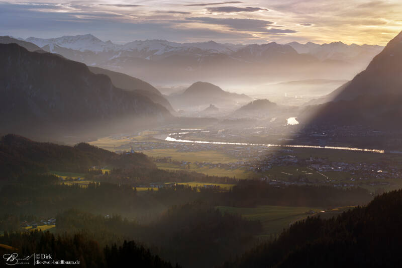 Das bedeutet derzeit, oben auf den Bergen herrscht sonnig mildes Wetter. Im Tal unten hält sich kühl-kalte Luft mit typischem Dunst und Nebel. Am späteren Nachmittag meldet sich dann tief stehend Klärchen mit ihren Strahlen zum Licht- und Schattenspiel. Hier in den beiden Bildern setzt sie Kufstein im Inntal ganz wundervoll in Szene. Man könnte es wohl nicht besser malen. So wird bei solch Föhnwetter ein Foto schnell zum Gemälde.