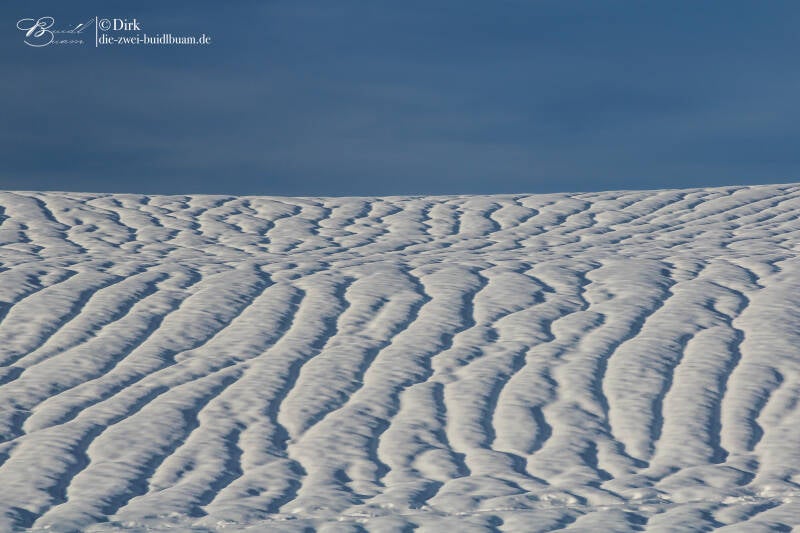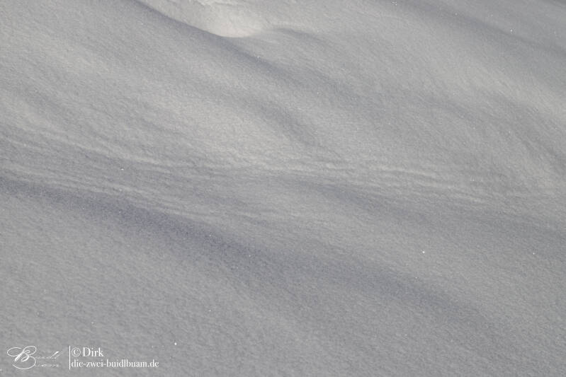 Unter der dicken Schneelage fließen Regen und Schmelzwasser in kleinen Rinnsalen gesammelt ab. Die geformten "Rinnen" im Schnee sind die im Boden verlaufenden Furchen, durch die besagtes Wasser den Berg / Hang nach unten abfließt. Zudem hat solch Regen und Tauwasser gesättigte Schneelage eine große Last / ein großes Gewicht. Diese / Dieses drückt den Hang nach unten. Die schwere Schneelage gleitet langsam und nur wenige Stücke auf der Bodenoberfläche ab. Sind zum Beispiel auf der Wiesenoberfläche Unebenheiten, so faltet es den Schnee an diesen auf. Diese gesamte auffaltende Struktur wird bis nach oben an die Schneeoberfläche sichtbar weitergegeben. Im optimalen Fall, wie hier im Bild, glätten Wind und Frost die Oberfläche ...