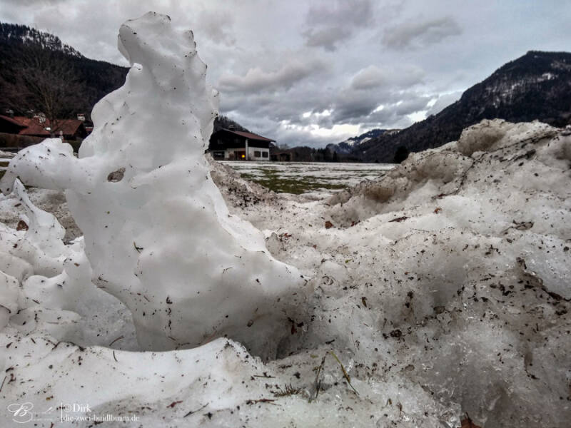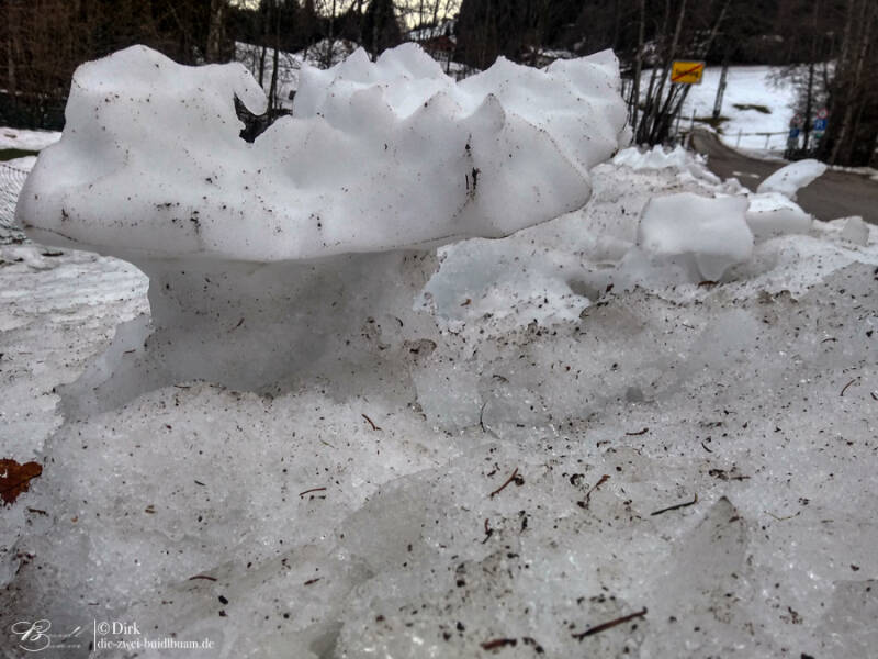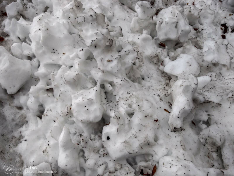 Wir haben noch so einiges an zusammen geschaufelten Altschnee aus den letzten Wochen, besonders an Straßen und Wegen liegen, welcher zwischenzeitlich immer wieder paar Neuschneeauflagen bekam. Teilweise liegen überall noch große Räumhaufen. Wie geschrieben, nun weht schon über ein paar Tage anhaltend warmer stürmischer Wind ohne großartige Pausen über die Altschneehaufen. Eingebunden immer wieder Regen samt Tauwetter. Die Konsistenz des Schnees in den Altschneehaufen ist sehr unterschiedlich. Mal ist er stark verdichtet, dann wieder locker oder sogar fest vereist. Je nach Beschaffenheit der Angriffsflächen kann jetzt der Wind als schaffender Künstler mehr oder weniger gut arbeiten. Er fräst und schleift fleißig, teilweise bizarre Strukturen. Je mehr er die Schneehaufen gestaltet, können sich z.B. an den entstehenden Strukturen zusätzliche und verschiedenste neuerliche Luftwirbel bilden. Das formt und gestaltet die Kunstwerke zusätzlich. Je weicher/unverdichteter die zu bearbeitenden Fläche, desto schneller wird sie natürlich weggetaut. Je widerstandsfähiger, desto länger und strukturierter kann der anhaltend wehende Wind gestaltend daran arbeiten. Wenn z.B. zwischenzeitlich nachts bei sich auftuenden Wolkenlücken Bodenfrost entsteht, durchfrosten die entstandenen Strukturen recht schnell und werden so wieder deutlich widerstandsfähiger. Und so kann der später wieder anfachende Wind neuerlich und weiter daran arbeiten. Geht das so wie aktuell über Tage, entstehen immer deutlichere und oft kurios anmutende Strukturen. Mal ist es nur ein einziger geformter "Eisberg", dann wieder ganze, mit verschiedensten Formen und Strukturen bestückt-gestaltete Fläche. Dann wieder ein regelrechter Eiscanyon oder sogar eine fein geschliffene Wand. Eine regelrechte Fantasiewelt kann so entstehen. Mit dem eingelagerten Dreck usw., welcher sich durch das Abschmelzen von Eis und Schnee immer mehr konzentriert, sieht das irgendwo aus, wie kleine Modelle aus arktischen Regionen. Oder auch aus Gletscherregionen - schlussendlich wie sehr anschauliche kleine Modelle von ewigem Schnee und Eis, welcher/welches durch den schnell fortschreitenden Klimawandel geschunden wird ...